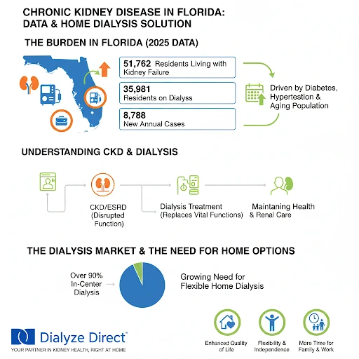 Florida has one of the highest burdens of kidney failure in the United States, with over 35,981 residents on dialysis and 51,762 living with kidney failure as of 2025. Each year, approximately 8,788 new cases are diagnosed, largely driven by diabetes, hypertension, and an aging population. The state’s dialysis market is extensive, with over 90% of treatments delivered in-center, highlighting a growing need for flexible home dialysis options that enhance quality of life.
